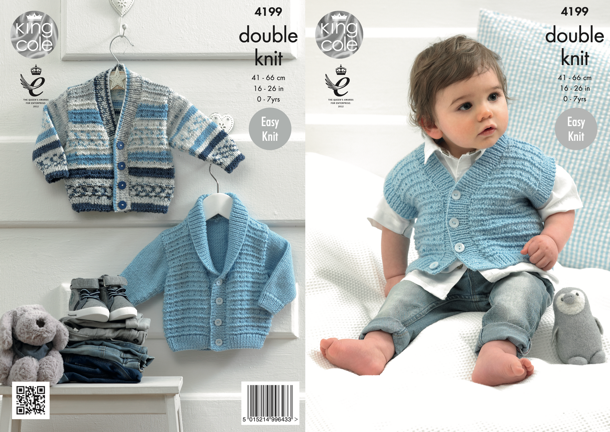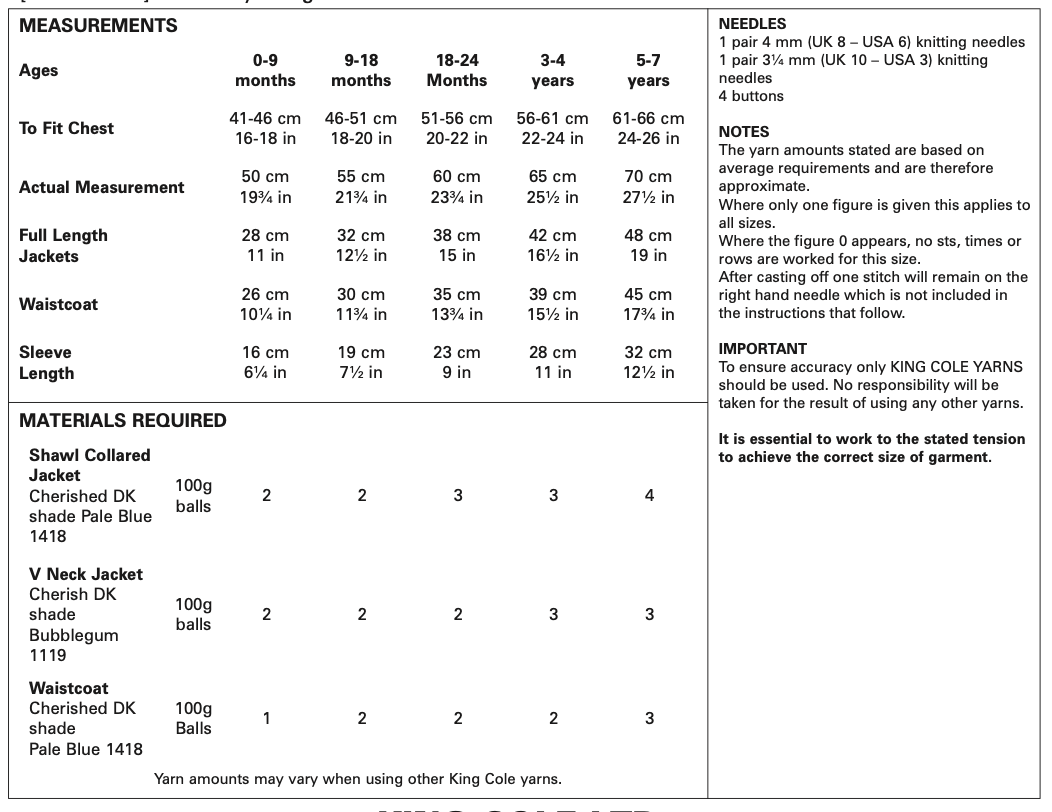 These garments are knitted in the plain King Cole Cherished DK and King Cole Cherish DK (it's variegated sister) which is a smooth and smooshy yarn, designed with babies in mind. I would also recommend looking at our King Cole Cottonsoft DK, a pure cotton yarn that is perfect for babies and lovely and cool for summer garments.