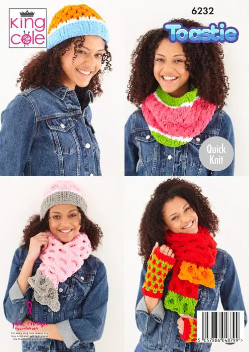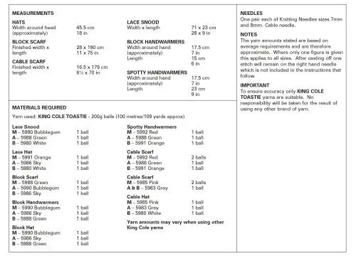Knit using King Cole's Warm & Toastie which is a brand new yarn that they've added to their range. Because the yarn is so thick, this would make the perfect beginner project and it'll knit up really quickly! The pattern gives you the instructions for a lace hat, lace snood, scarf, hand warmers and a block colour hat.