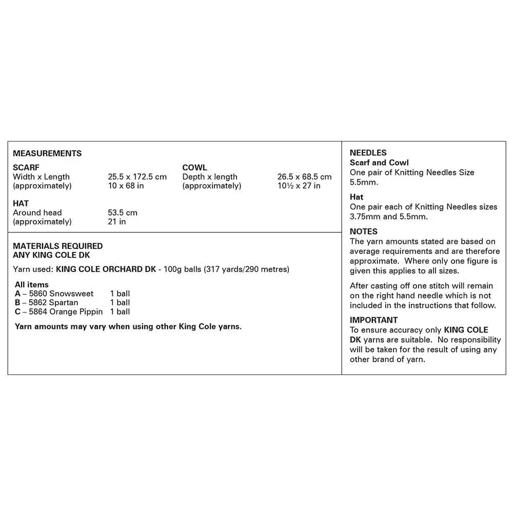 You'll need a pair of 5.5mm needles for all 3 accessories and a 3.75mm needle for the rib of the hat.