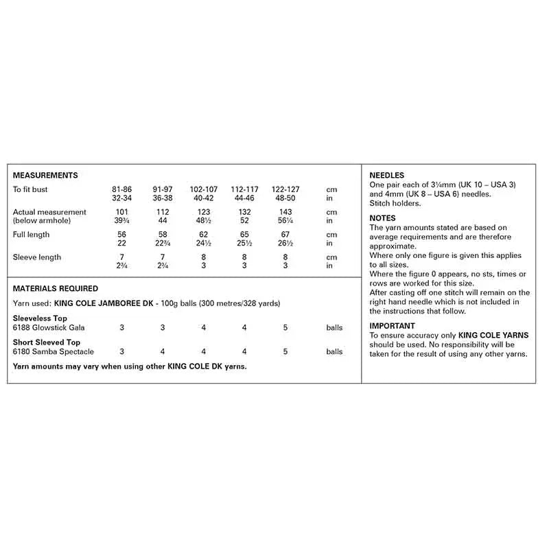 Model wears King Cole Jamboree DK in Glowstick Gala 6188 (Sleeveless top) and Samba Spectacle 6280 (Short Sleeved Top)