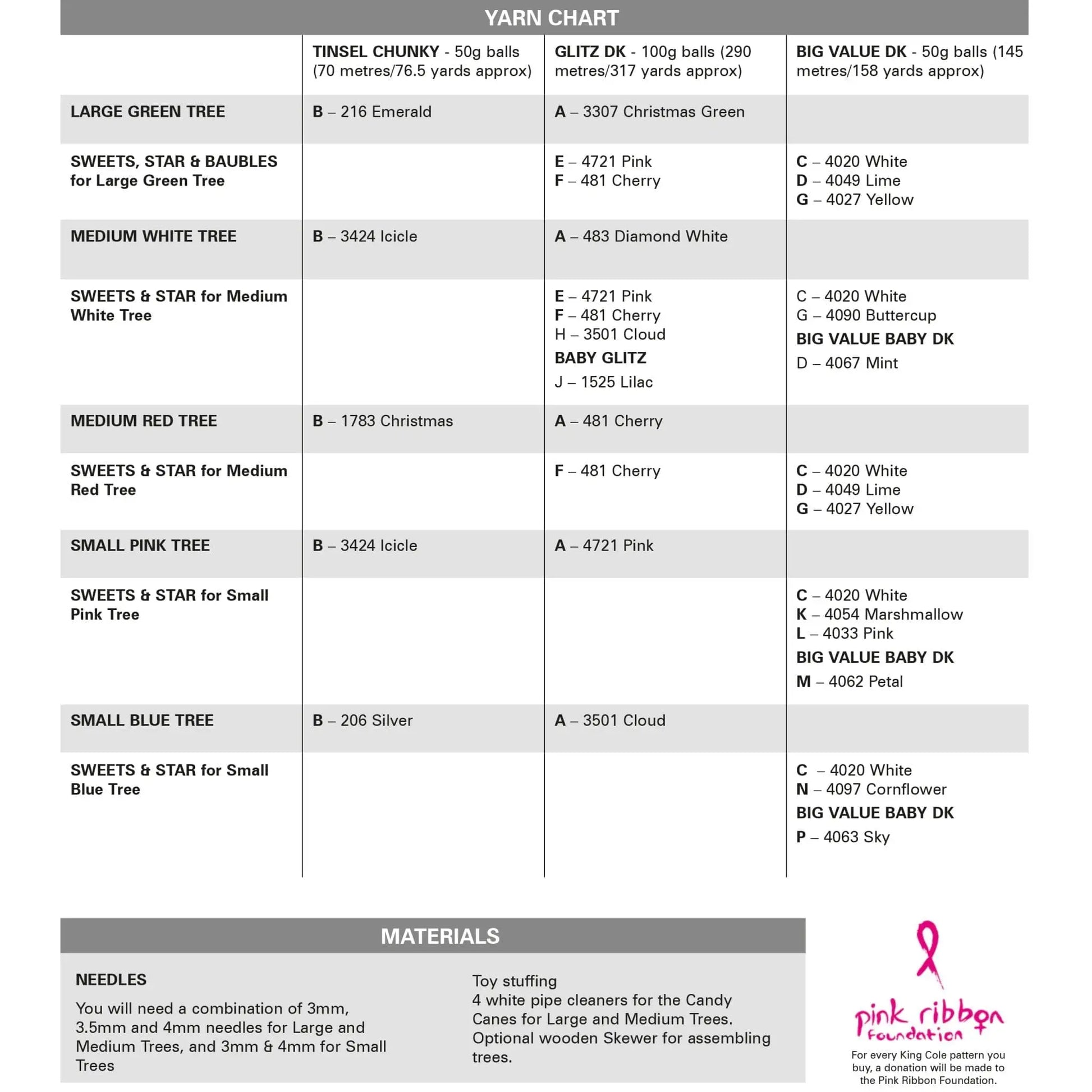These have been knitted in King Cole Tinsel Chunky, King Cole Cuddles Chunky, Glitz DK and we're recommending King Cole's Pricewise DK. You'll need 3mm, 3.5mm and 4mm needles, pipe cleaners for the candy canes and toy stuffing.