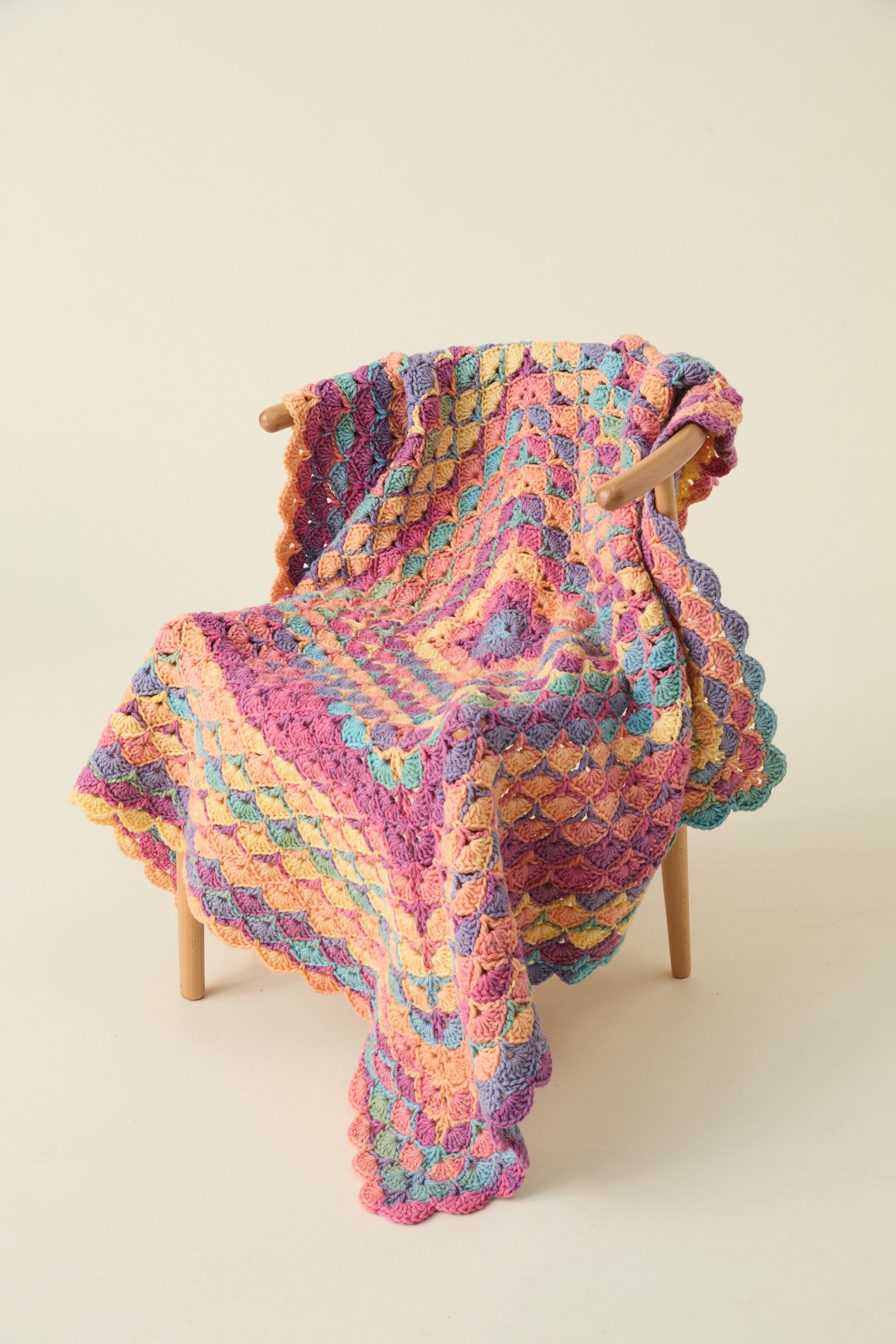 Made in rounds, so there’s no sewing up, the deceptively simple clusters of trebles provide a peaceful, repetitive crochet pattern. The result is a beautiful scallop effect with gentle clouds of colour that radiate from the centre of your Crochet Cloud Blanket.