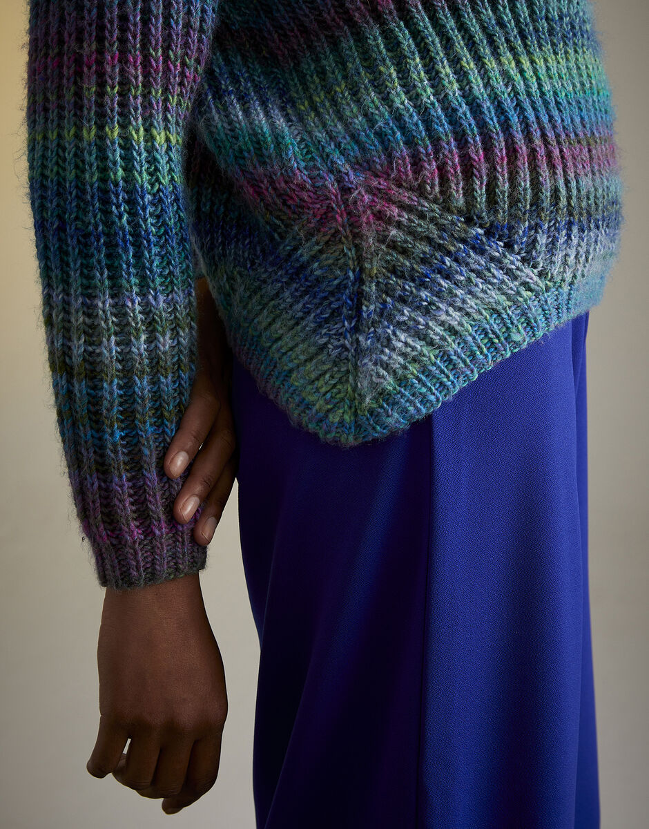 A luxurious scarf and sweater combo knit in cosy fisherman rib. The knitting pattern features angled rib insets at each side of the sweater hem, repeated at one end of the scarf and echoed in the elegant raglan shaping of the sleeves. A tubular rib neckband completes the sophisticated finish of this hand knit.