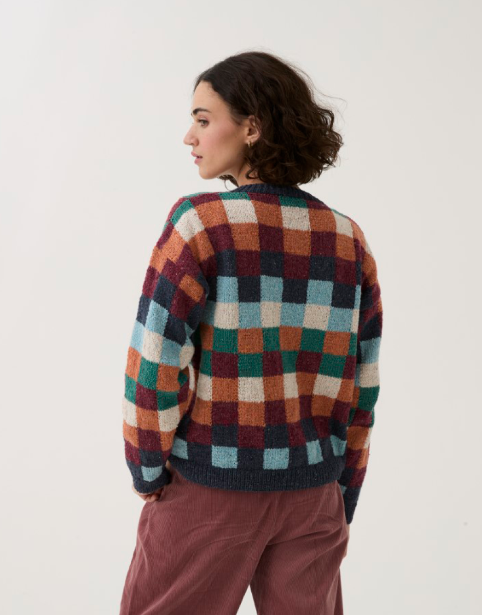 This colourful crew-neck cardigan knitting pattern is easier than it looks. The drop shoulders mean there is minimum shaping so you can focus on creating the stunning intarsia checkerboard pattern.