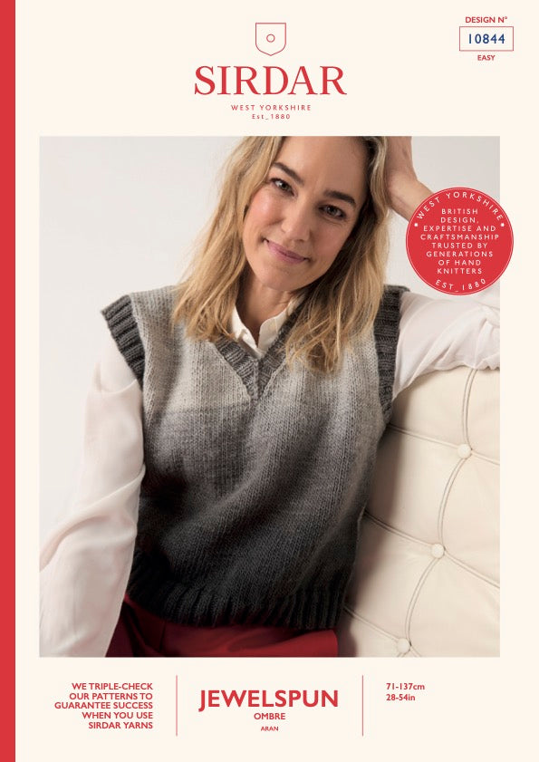 Make this stunning vest with just one ball! A clever layering piece, this v neck vest has sleek tapered ribs so there’s no bulky fabric under the armholes. Picking up stitches for the neckband and rib creates striking Jewelspun Ombre colour contrasts, which will be unique to each garment.