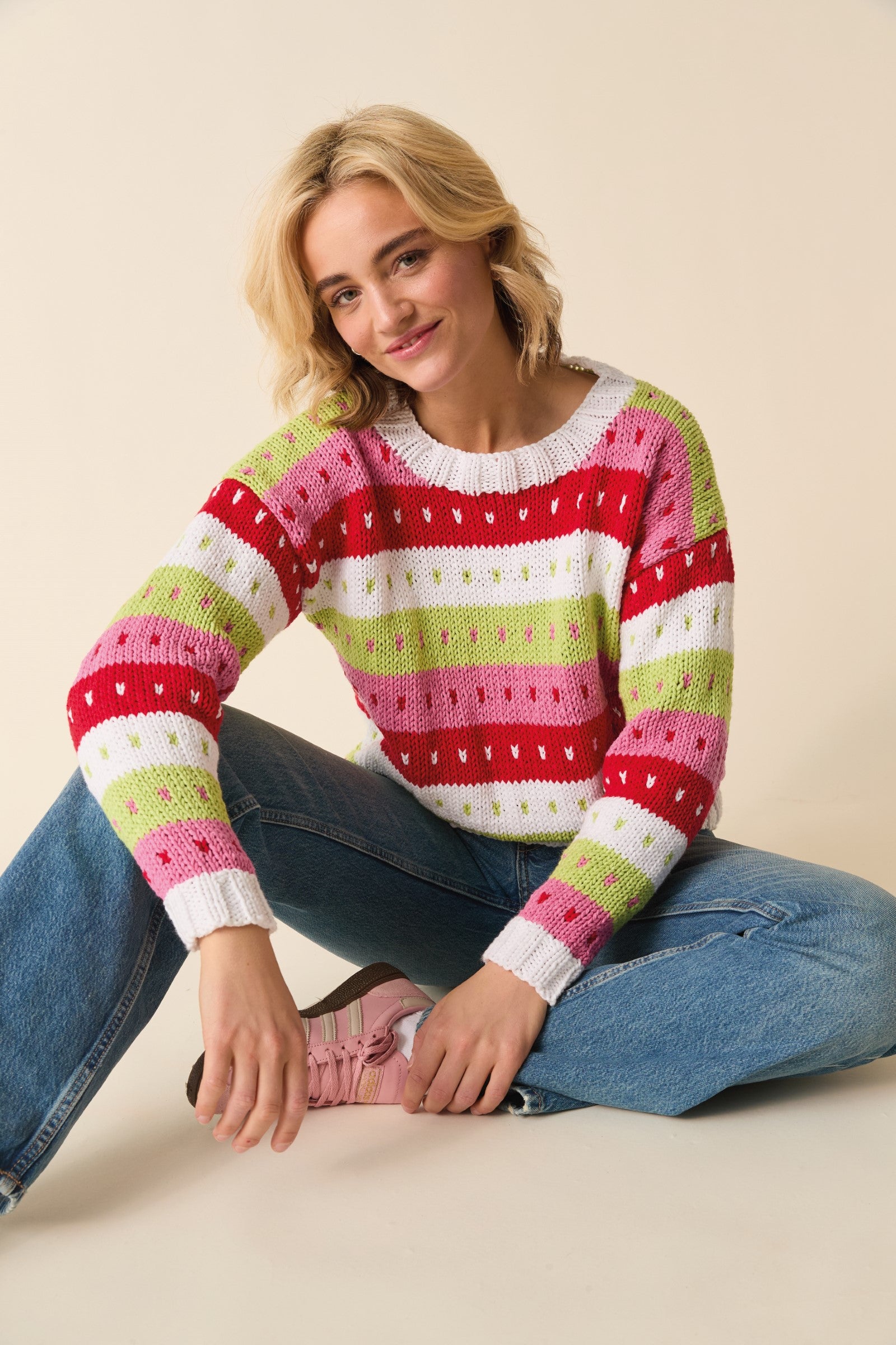 This sweater knitting pattern, with its chunky stripe and spot design, is the ideal introduction to Fair Isle knitting. Drop sleeves and a relaxed, boxy shape keep things simple so you can focus on your colour-changes in quick-knit Sirdar Stories Chunky.
