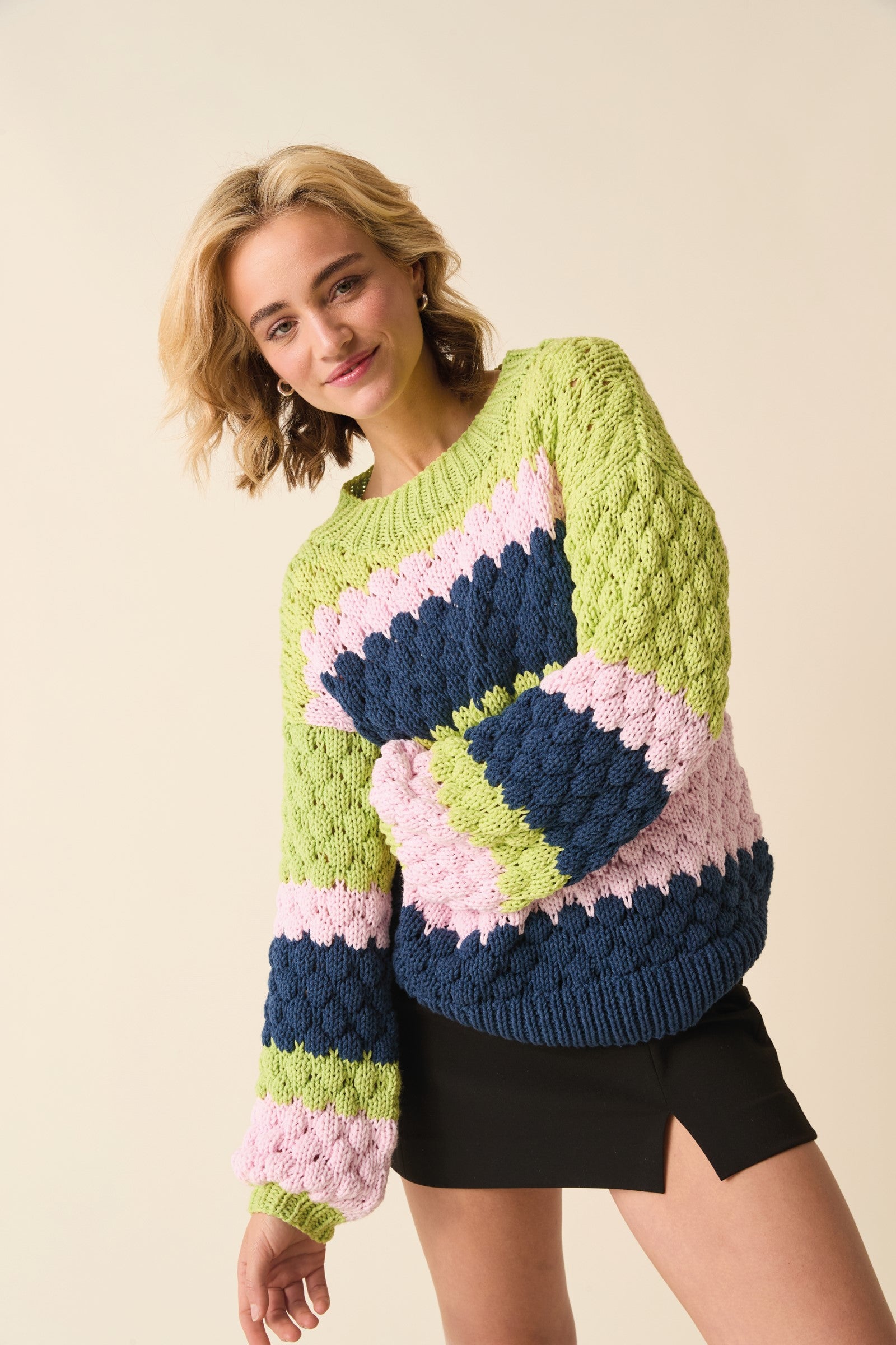 Stand out in a sweater that really pops! This bubble stitch knitting pattern creates striking scallop-edged stripes with extra bubbly personality in fashionable, quick-knit Sirdar Stories Chunky.