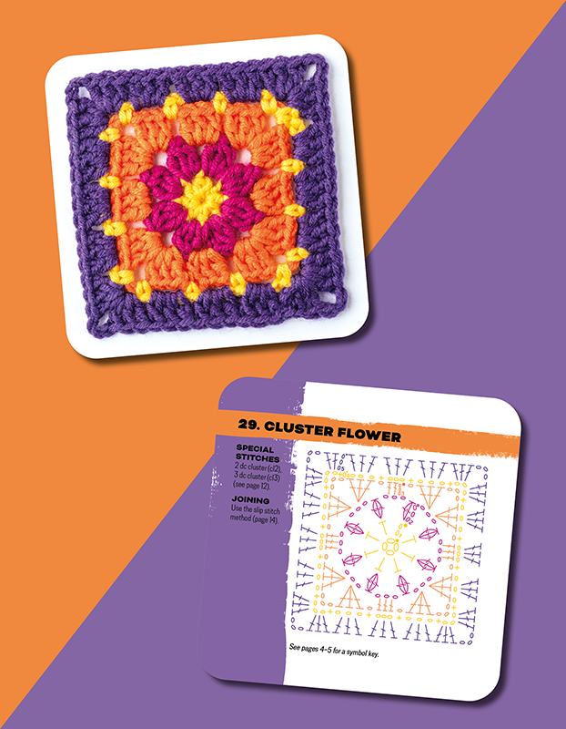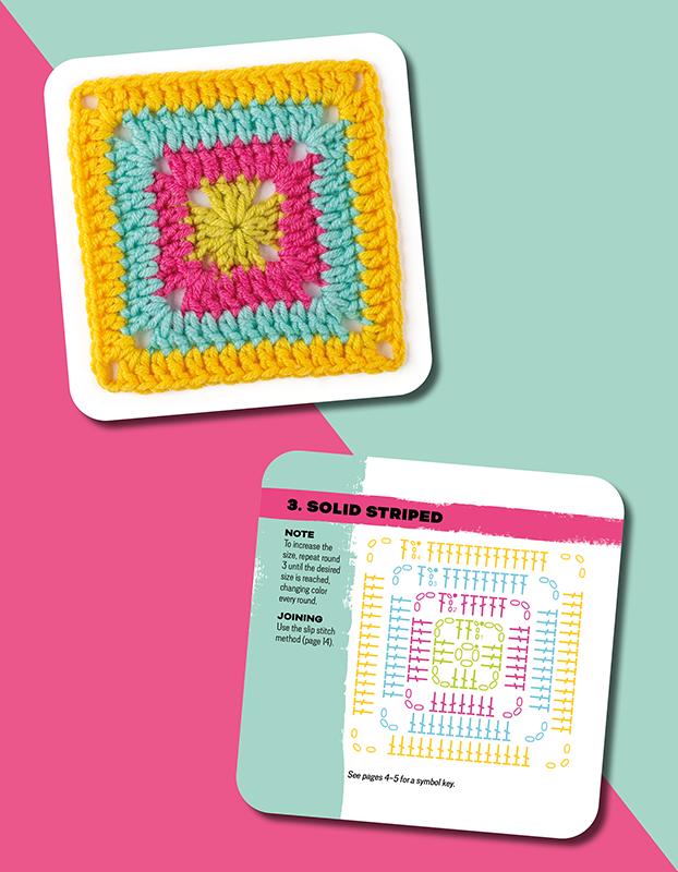 - The sturdy, stylish box contains 50 colourful cards, each with a gorgeous granny square to make, mix and match. On the front of each 10 x 10cm (4 x 4in) card is a colour photograph of the finished granny square, while on the back you'll find a crochet stitch chart that shows you how to work the square, along with joining advice and any other helpful information you need. Simply lay out the cards to easily mix, match and create your own design combinations.